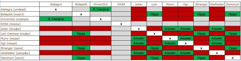 | Союза на данный момент три: Альянс: люди Огра, люди Мумра, эльфы Джокера и гном Убела Орда: орки Ксенонума, орки Стренджера, темные эльфы Лоина и нурглы Болеполка Легионы смерти: кхемри Димона и андеды Алетагро ДК84 пока беспартийный