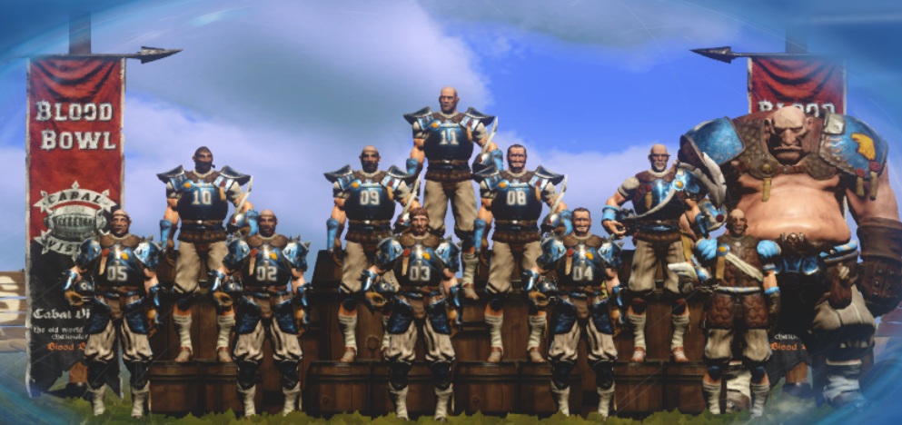 | Есть подозрение что левые во втором ряду и верхний - это труверы. У них наплечников на правой руке нет, что было бы адекватно для игроков пасующих мяч. А вот 6, 5, 7 и 8 скорее всего лайнмены тогда, а 01 и 02 - блитцеры. Ибо насколько помню если брать огра то на 2х кэтчеров + 2 трувера + 4 блитцера денег не хватает (ну или хватает с диким минимумом реролов). Видимо все между игроками в команде людей в наплечниках и шлемах